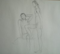 Desenho de movimento, contorno e modelação de 2 poses alternadas. Modelo: Gabriel. Tempo: 25 min. Material: lápis de grafite e folha A2.